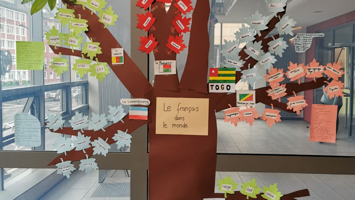 Die Klasse 8b entschied sich für einen Wörterbaum, der mit Begriffen aus allen Teilen der frankophonen Welt geschmückt wurde – von engéans („engagiert“ in Luxembourg) über paddy („ungeschälter Reis“ aus Madagaskar) bis hin zu cora (ein Instrument aus Cameroun) – und seit Januar vor dem Sekretariat zu bewundern ist.