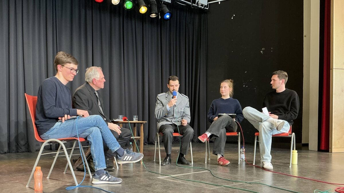 Auf dem Podium diskutierten Stephan Schmitz (Mitglied der Deutschen Friedensgesellschaft DFG-VK) sowie Hauptmann Jean-Pascal Östreich (Jugendoffizier der Bundeswehr) und vertraten konträre Positionen . Moderiert wurde das Gespräch von Josefine O. (EF), Samuel H. (Q1) und Herrn Ehrenberg.