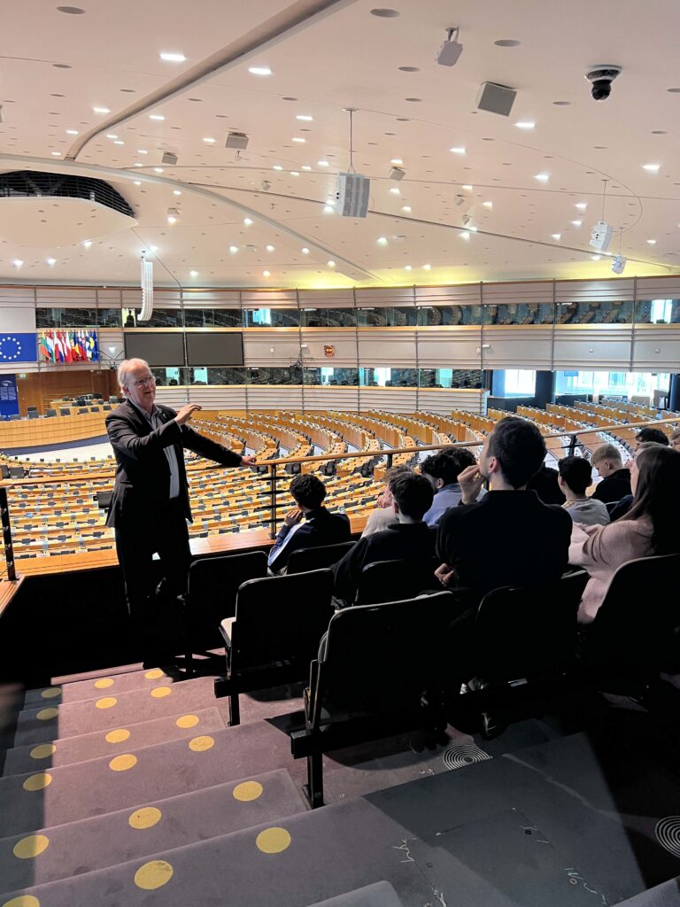 Am 15.04.2026 besuchten die Sowi-Kurse der Jgst. EF das Europaparlament in Brüssel. Die Schüler:innen wurden vom Europaabgeordneten Axel Voss (EVP-Fraktion) empfangen. Mit Blick von der Besuchertribüne in den Plenarsaal beantwortete Herr Voss die Fragen der Schüler:innen. Insbesondere die Klimapolitik wurde kontrovers diskutiert. Aber auch die Wirtschaft war ein wichtiges Thema, das angesprochen wurde.